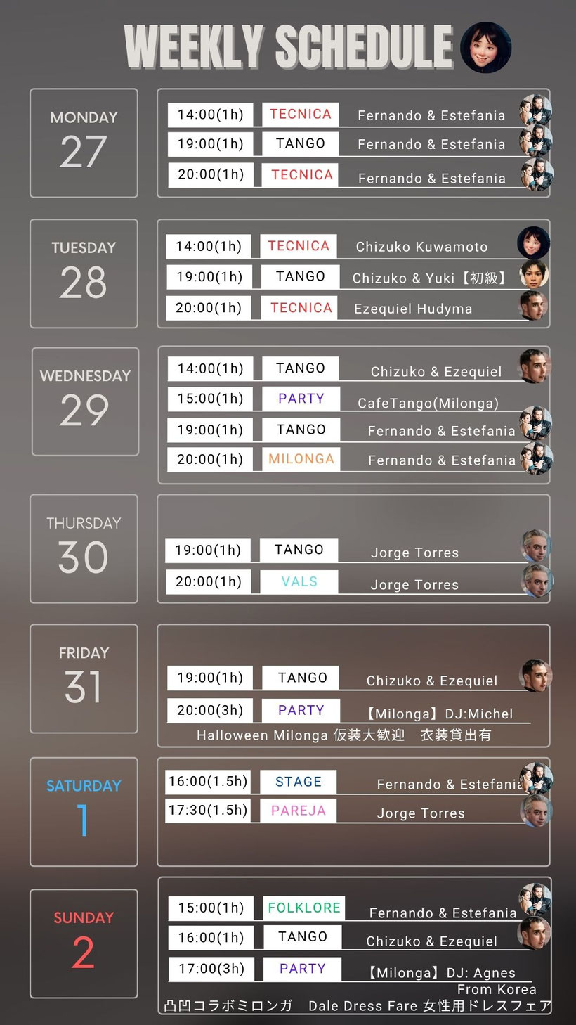 レッスンスケジュールやミロンガは、週によって時間や内容が変更になる場合がございます。毎週更新の下記スケジュール、もしくは毎朝更新されるChily's Blogをご確認ください。